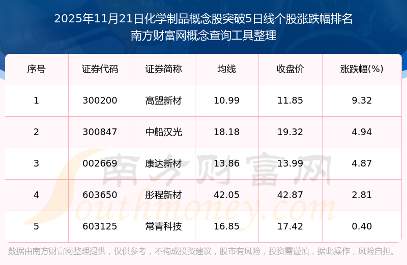 2025年11月21日化學制品概念股突破5日線個股漲跌幅排名