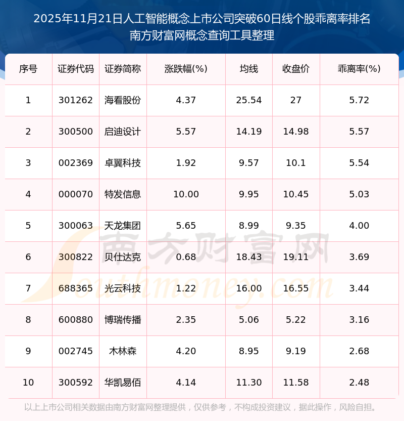 2025年11月21日人工智能概念上市公司突破60日線個股乖離率排名