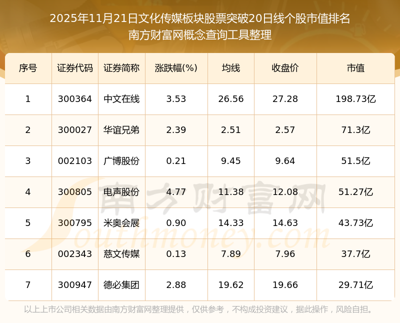 2025年11月21日文化傳媒板塊股票突破20日線個(gè)股市值排名