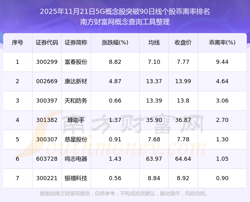 2025年11月21日5G概念股突破90日線個(gè)股乖離率排名