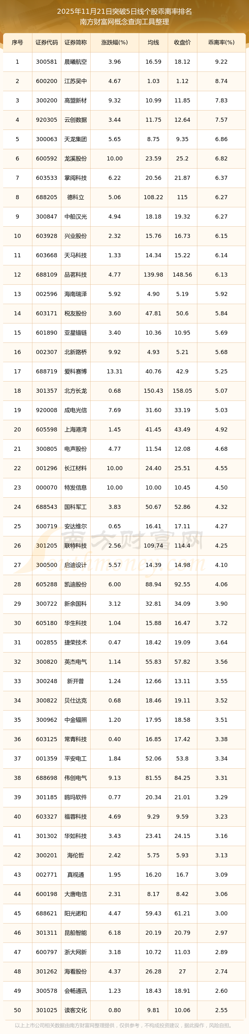 根據(jù)南方財富網(wǎng)概念查詢工具數(shù)據(jù)統(tǒng)計,截止2025年11月21日收盤,共有96只個股收盤價向上突破了5日線,其中乖離率較大的個股有晨曦航空、江蘇吳中、高盟新材、云創(chuàng)數(shù)據(jù)、天龍集團(tuán)等,乖離率分別為9.22%、8.74%、7.83%、7.57%、6.86%。