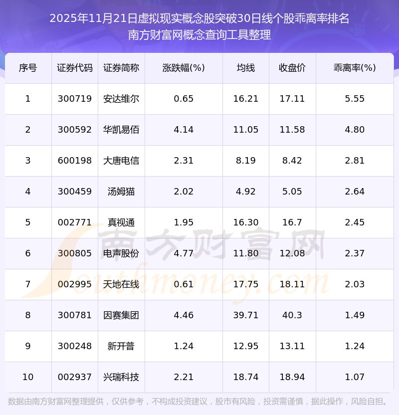 2025年11月21日虛擬現(xiàn)實(shí)概念股突破30日線個(gè)股乖離率排名