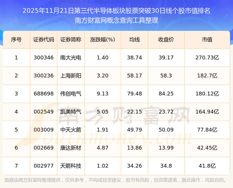 2025年11月21日第三代半導體板塊股票突破30日線個股市值排名