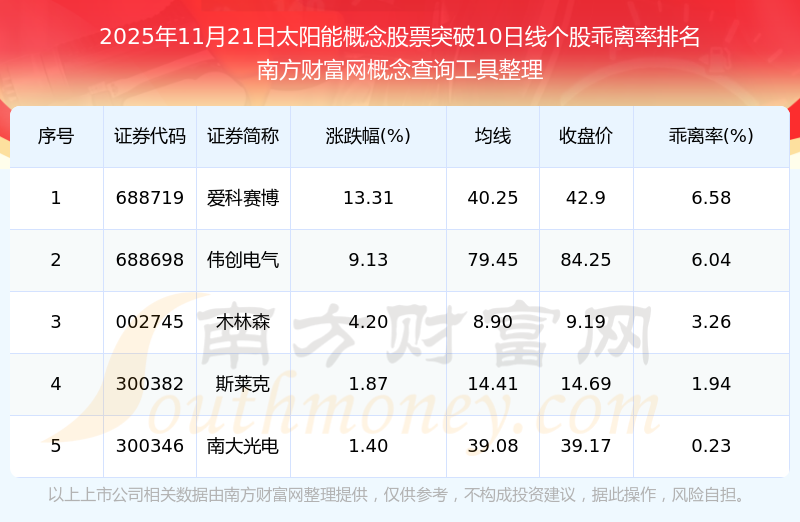 根據(jù)南方財(cái)富網(wǎng)概念查詢工具數(shù)據(jù)統(tǒng)計(jì),截止2025年11月21日收盤,太陽能概念股票共有5只個(gè)股收盤價(jià)向上突破了10日線。其中乖離率較大的個(gè)股有愛科賽博、偉創(chuàng)電氣、木林森等,乖離率分別為6.58%、6.04%、3.26%。
