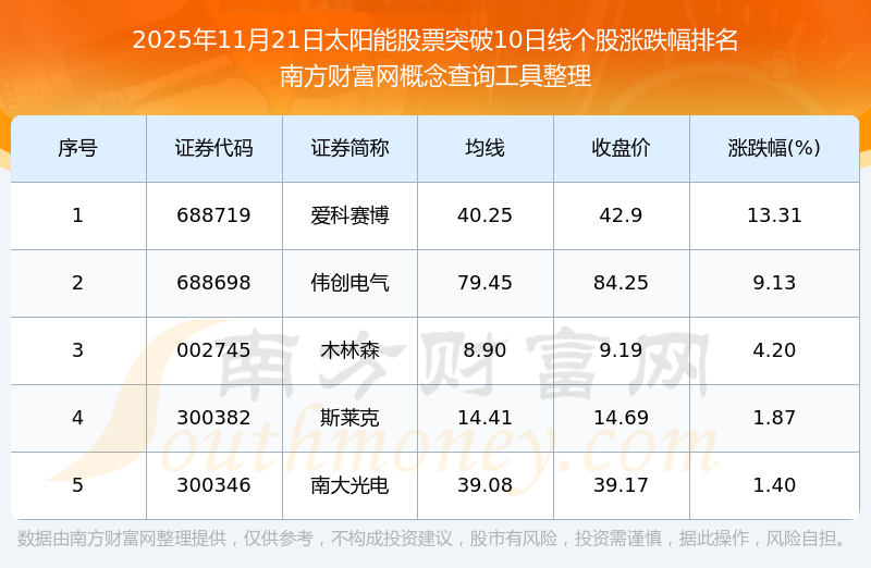 2025年11月21日太陽能股票突破10日線個(gè)股漲跌幅排名