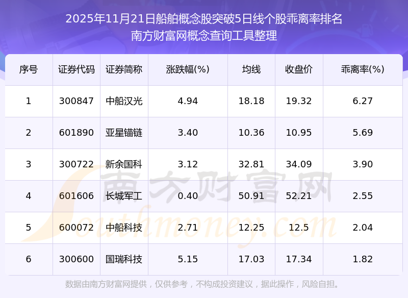 根據(jù)南方財富網(wǎng)概念查詢工具數(shù)據(jù)統(tǒng)計,截止2025年11月21日收盤,船舶概念股共有6只個股收盤價向上突破了5日線。其中乖離率較大的個股有中船漢光、亞星錨鏈、新余國科等,乖離率分別為6.27%、5.69%、3.90%。
