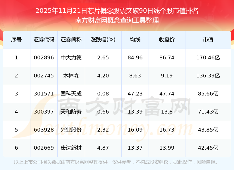 2025年11月21日芯片概念股票突破90日線個(gè)股市值排名