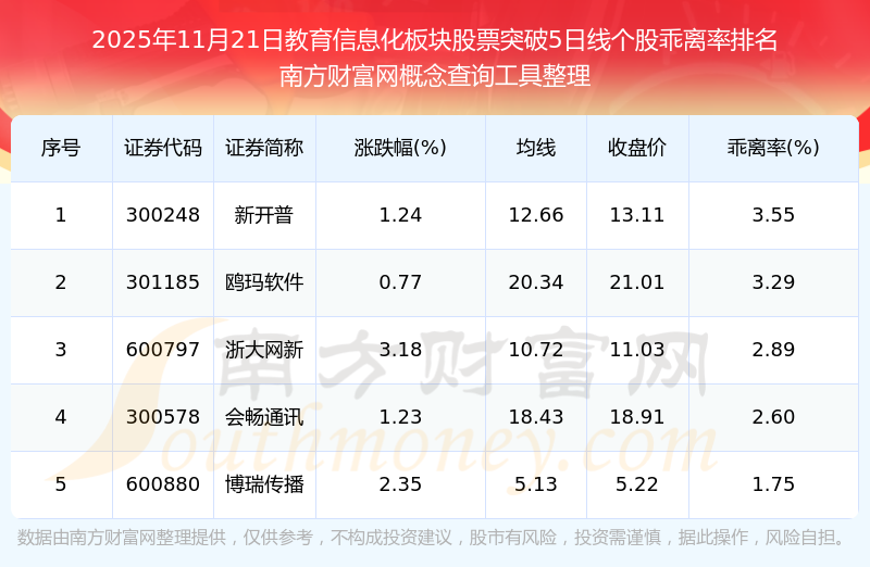 2025年11月21日教育信息化板塊股票突破5日線個股乖離率排名