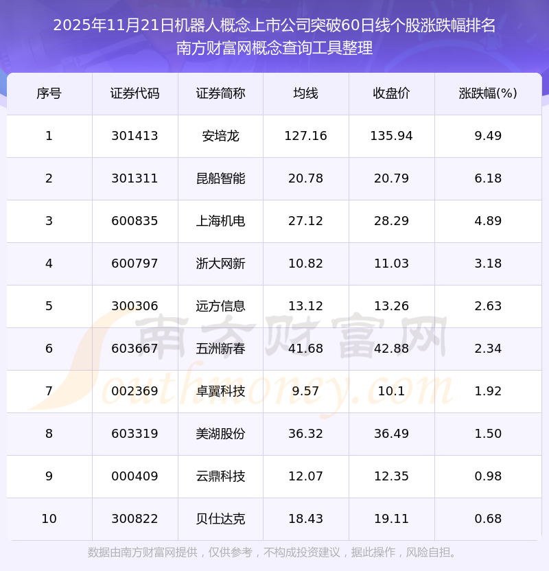 2025年11月21日機(jī)器人概念上市公司突破60日線個(gè)股漲跌幅排名