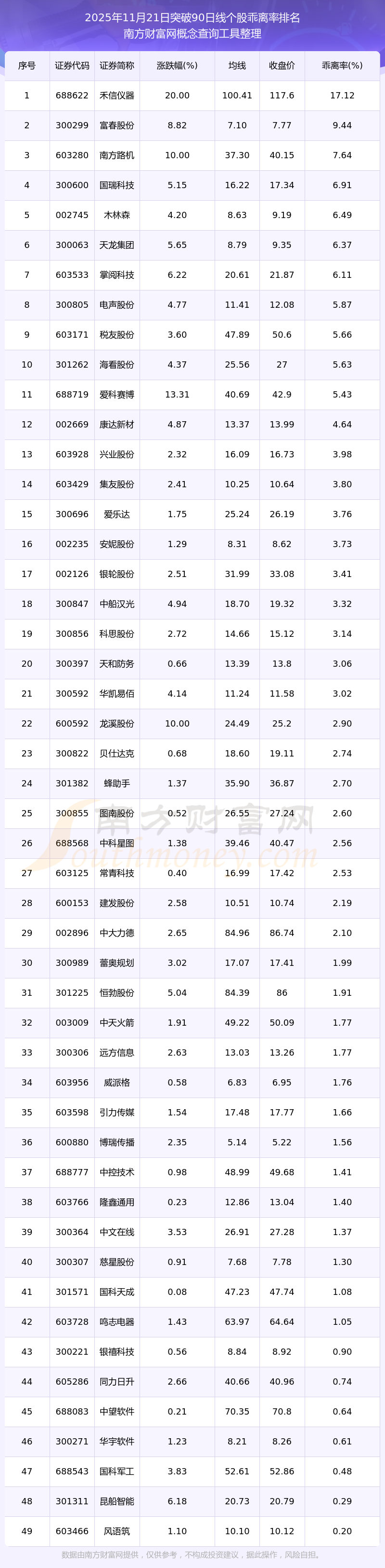 根據(jù)南方財(cái)富網(wǎng)概念查詢工具數(shù)據(jù)統(tǒng)計(jì),截止2025年11月21日收盤,共有49只個(gè)股收盤價(jià)向上突破了90日線,其中乖離率較大的個(gè)股有禾信儀器、富春股份、南方路機(jī)、國瑞科技、木林森等,乖離率分別為17.12%、9.44%、7.64%、6.91%、6.49%。