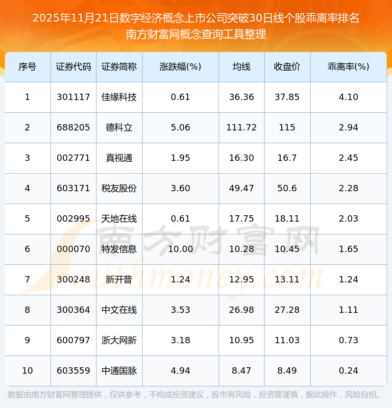 2025年11月21日數(shù)字經(jīng)濟概念上市公司突破30日線個股乖離率排名