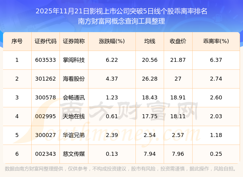 2025年11月21日影視上市公司突破5日線個(gè)股乖離率排名
