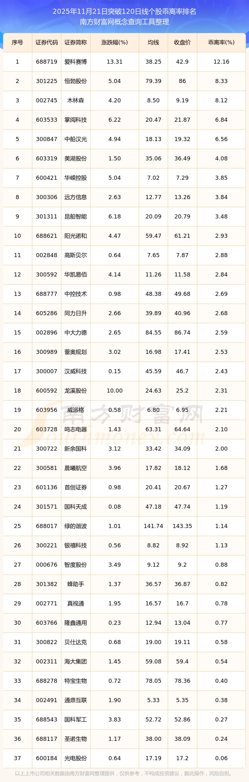 根據(jù)南方財富網概念查詢工具數(shù)據(jù)統(tǒng)計,截止2025年11月21日收盤,共有37只個股收盤價向上突破了半年線,其中乖離率較大的個股有愛科賽博、恒勃股份、木林森、掌閱科技、中船漢光等,乖離率分別為12.16%、8.33%、8.12%、6.84%、6.56%。