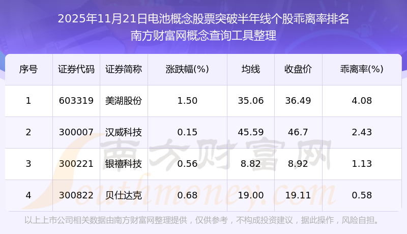 2025年11月21日電池概念股票突破半年線個(gè)股乖離率排名