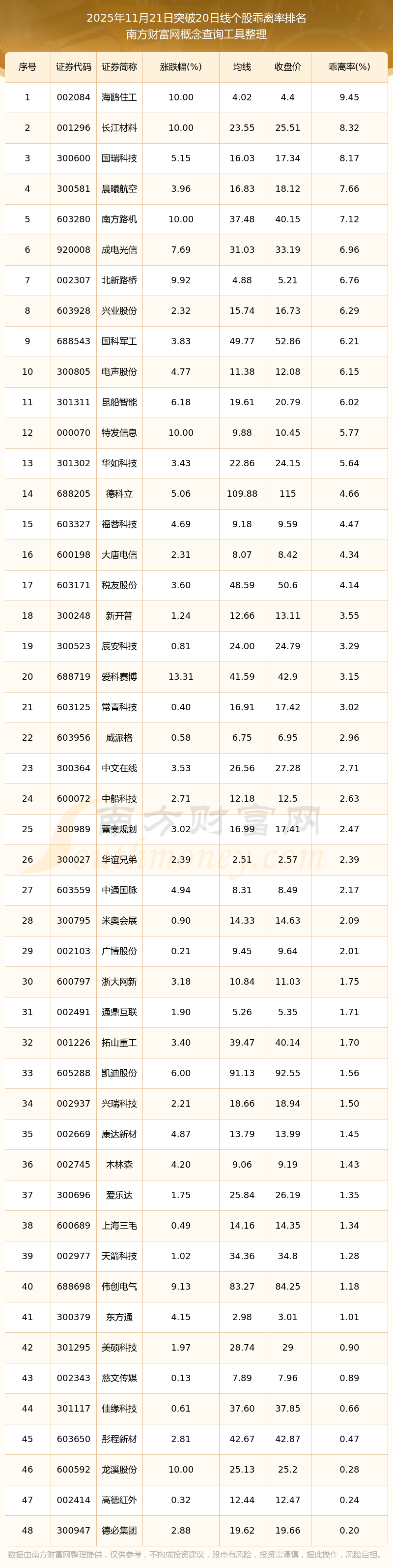 根據(jù)南方財富網(wǎng)概念查詢工具數(shù)據(jù)統(tǒng)計,截止2025年11月21日收盤,共有48只個股收盤價向上突破了20日線,其中乖離率較大的個股有海鷗住工、長江材料、國瑞科技、晨曦航空、南方路機等,乖離率分別為9.45%、8.32%、8.17%、7.66%、7.12%。