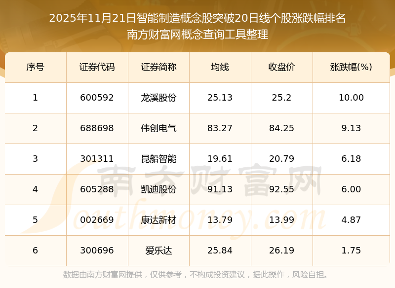 根據(jù)南方財(cái)富網(wǎng)概念查詢工具數(shù)據(jù)統(tǒng)計(jì),截止2025年11月21日收盤,智能制造概念股共有6只個(gè)股收盤價(jià)向上突破了20日線。其中漲幅較大的個(gè)股有龍溪股份、偉創(chuàng)電氣、昆船智能等,漲幅分別為10.00%、9.13%、6.18%。