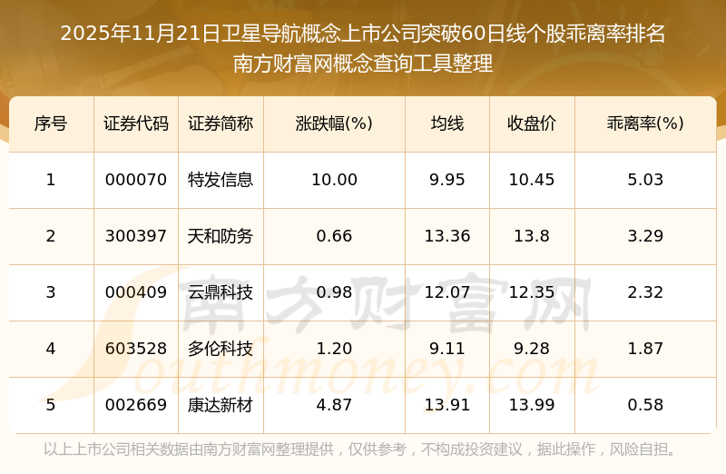 根據(jù)南方財(cái)富網(wǎng)概念查詢工具數(shù)據(jù)統(tǒng)計(jì),截止2025年11月21日收盤,衛(wèi)星導(dǎo)航概念上市公司共有5只個(gè)股收盤價(jià)向上突破了60日線。其中乖離率較大的個(gè)股有特發(fā)信息、天和防務(wù)、云鼎科技等,乖離率分別為5.03%、3.29%、2.32%。