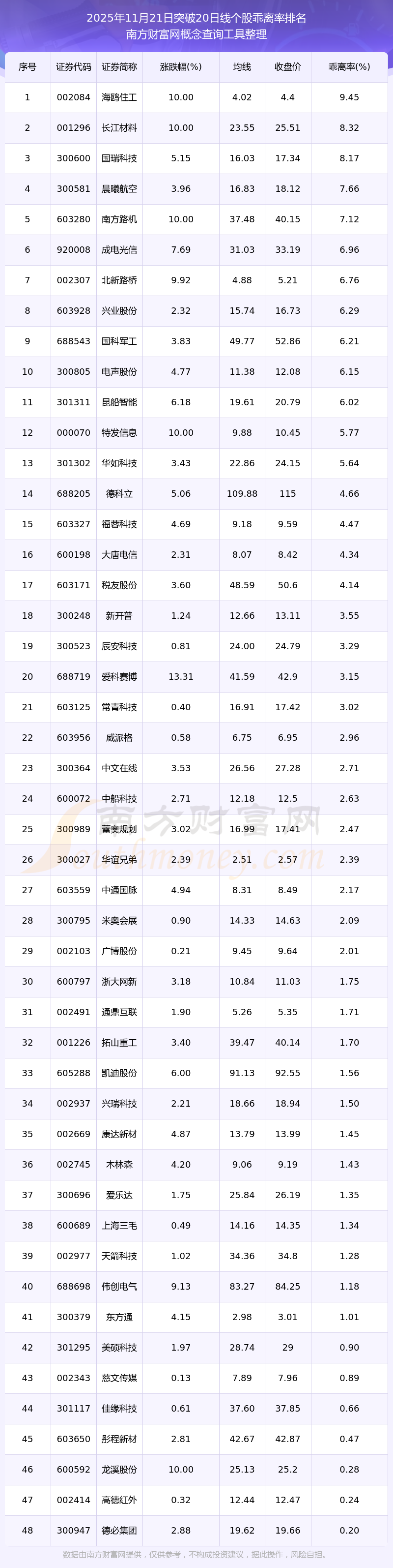 2025年11月21日突破20日線個(gè)股乖離率排名