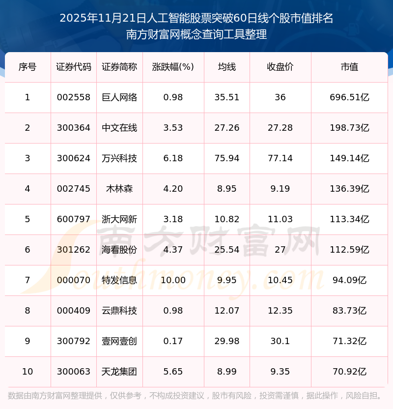 根據(jù)南方財富網(wǎng)概念查詢工具數(shù)據(jù)統(tǒng)計,截止2025年11月21日收盤,人工智能股票共有23只個股收盤價向上突破了60日線。其中市值較大的個股有巨人網(wǎng)絡、中文在線、萬興科技等,市值分別為696.51億、198.73億、149.14億。