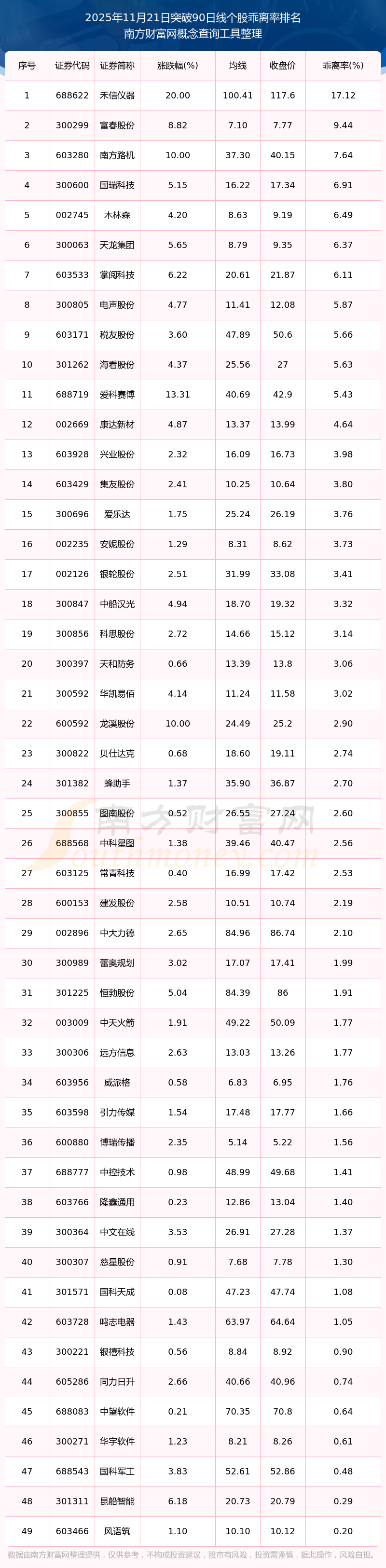 根據南方財富網概念查詢工具數據統(tǒng)計,截止2025年11月21日收盤,共有49只個股收盤價向上突破了90日線,其中乖離率較大的個股有禾信儀器、富春股份、南方路機、國瑞科技、木林森等,乖離率分別為17.12%、9.44%、7.64%、6.91%、6.49%。