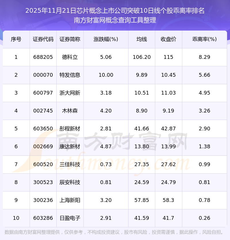 2025年11月21日芯片概念上市公司突破10日線個(gè)股乖離率排名