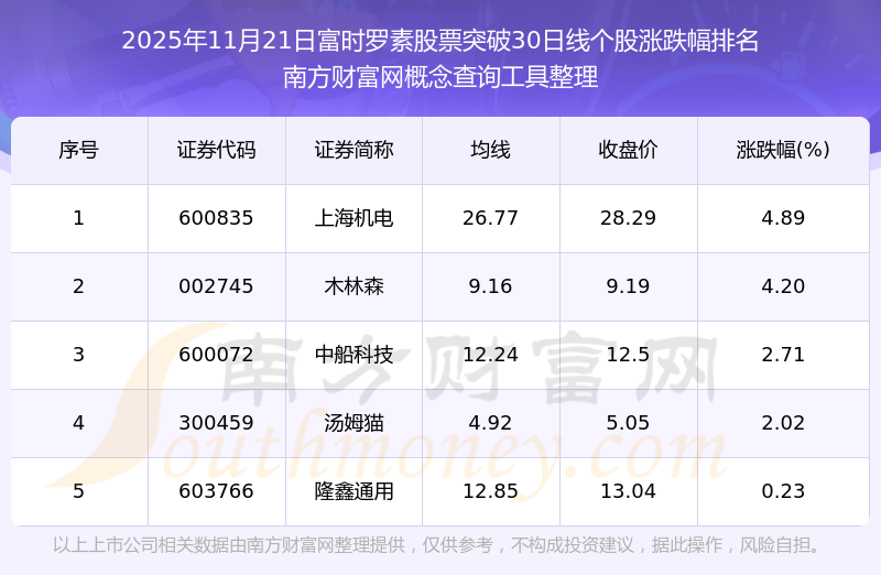 根據(jù)南方財(cái)富網(wǎng)概念查詢工具數(shù)據(jù)統(tǒng)計(jì),截止2025年11月21日收盤,富時羅素股票共有5只個股收盤價(jià)向上突破了30日線。其中漲幅較大的個股有上海機(jī)電、木林森、中船科技等,漲幅分別為4.89%、4.20%、2.71%。