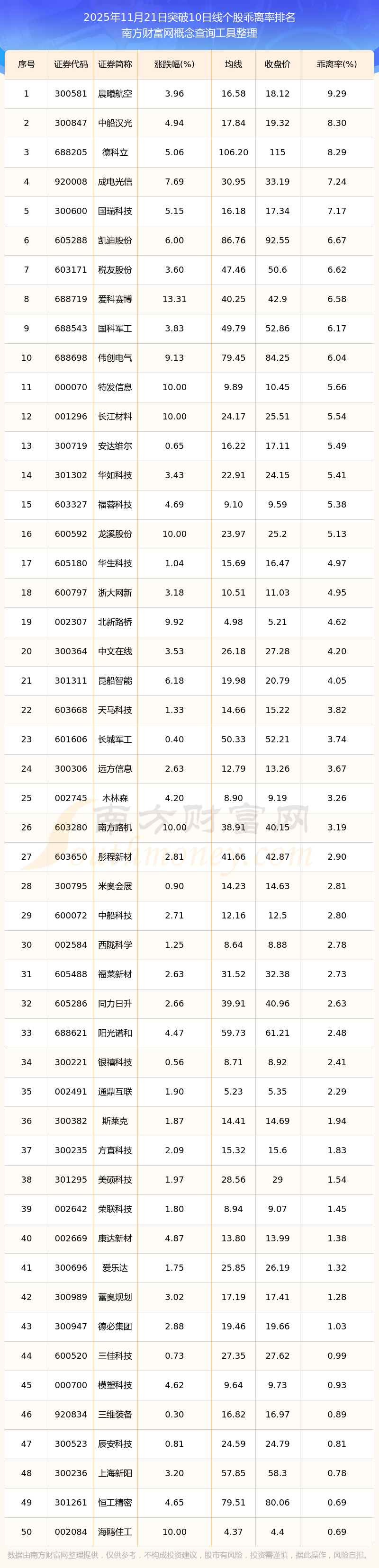 根據(jù)南方財富網(wǎng)概念查詢工具數(shù)據(jù)統(tǒng)計,截止2025年11月21日收盤,共有63只個股收盤價向上突破了10日線,其中乖離率較大的個股有晨曦航空、中船漢光、德科立、成電光信、國瑞科技等,乖離率分別為9.29%、8.30%、8.29%、7.24%、7.17%。