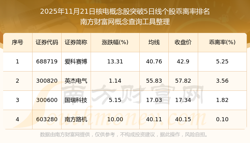 2025年11月21日核電概念股突破5日線個(gè)股乖離率排名