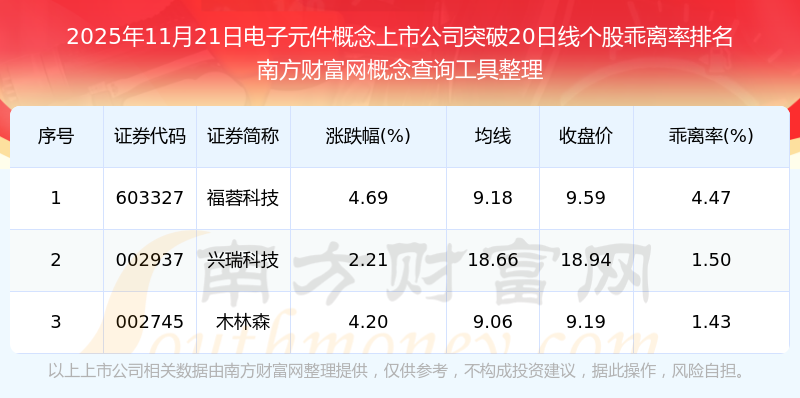 根據(jù)南方財富網概念查詢工具數(shù)據(jù)統(tǒng)計,截止2025年11月21日收盤,電子元件概念上市公司共有3只個股收盤價向上突破了20日線。其中乖離率較大的個股有福蓉科技、興瑞科技、木林森等,乖離率分別為4.47%、1.50%、1.43%。