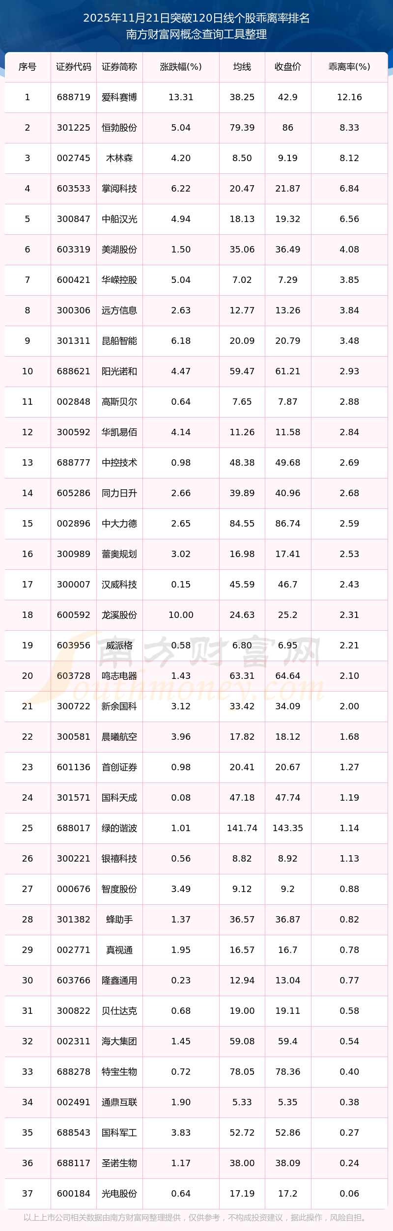根據(jù)南方財富網(wǎng)概念查詢工具數(shù)據(jù)統(tǒng)計,截止2025年11月21日收盤,共有37只個股收盤價向上突破了半年線,其中乖離率較大的個股有愛科賽博、恒勃股份、木林森、掌閱科技、中船漢光等,乖離率分別為12.16%、8.33%、8.12%、6.84%、6.56%。