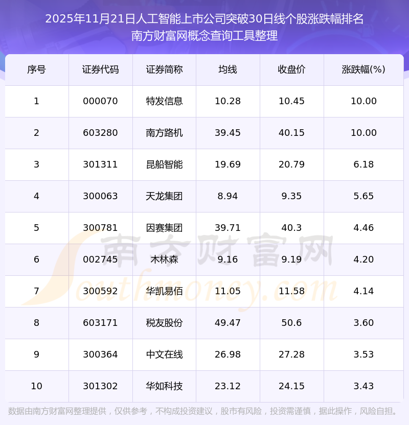 2025年11月21日人工智能上市公司突破30日線個(gè)股漲跌幅排名