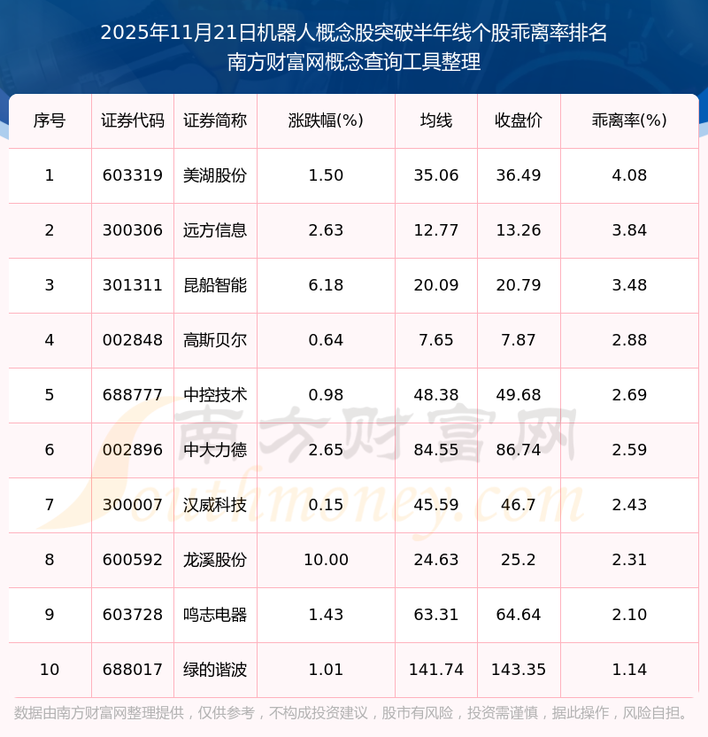 2025年11月21日機(jī)器人概念股突破半年線個(gè)股乖離率排名