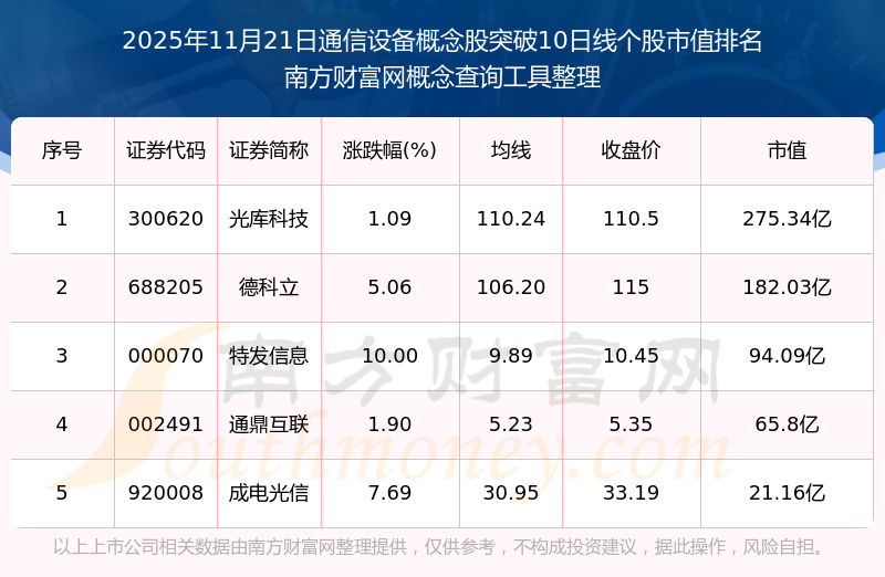 2025年11月21日通信設(shè)備概念股突破10日線個股市值排名
