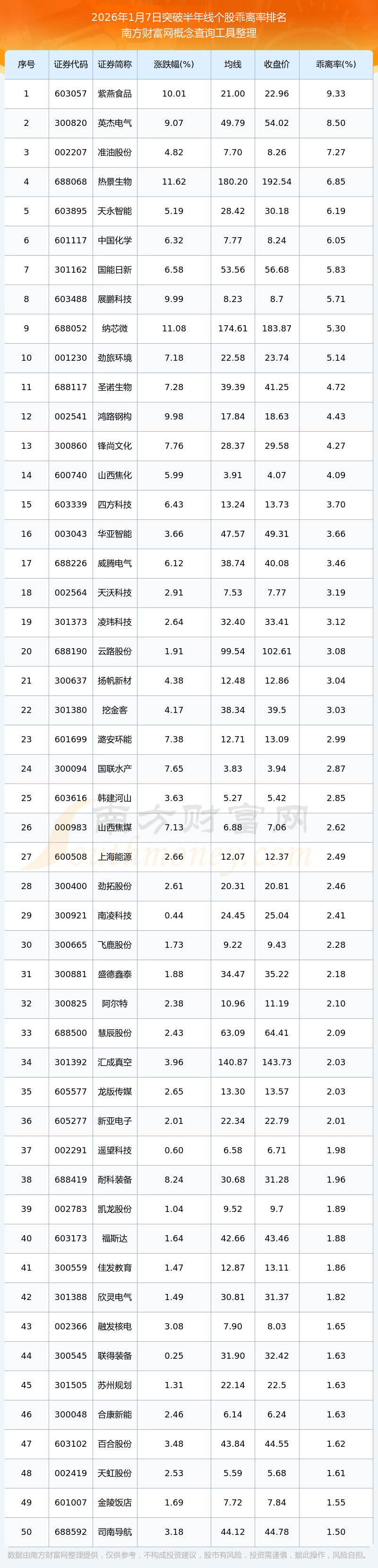 根據南方財富網概念查詢工具數據統計,截止2026年1月7日收盤,共有109只個股收盤價向上突破了半年線,其中乖離率較大的個股有紫燕食品、英杰電氣、準油股份、熱景生物、天永智能等,乖離率分別為9.33%、8.50%、7.27%、6.85%、6.19%。