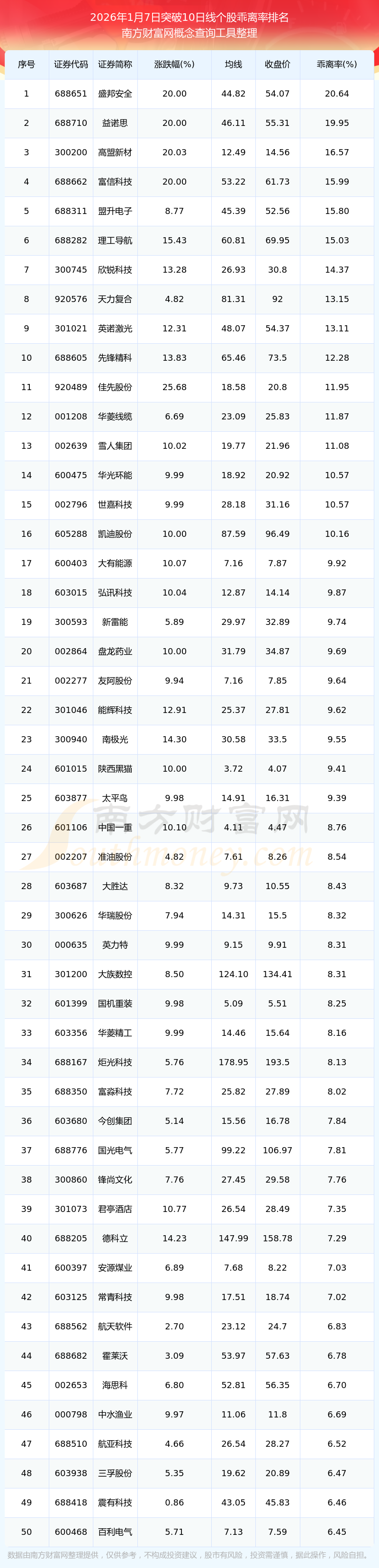 2026年1月7日突破10日線個(gè)股乖離率排名