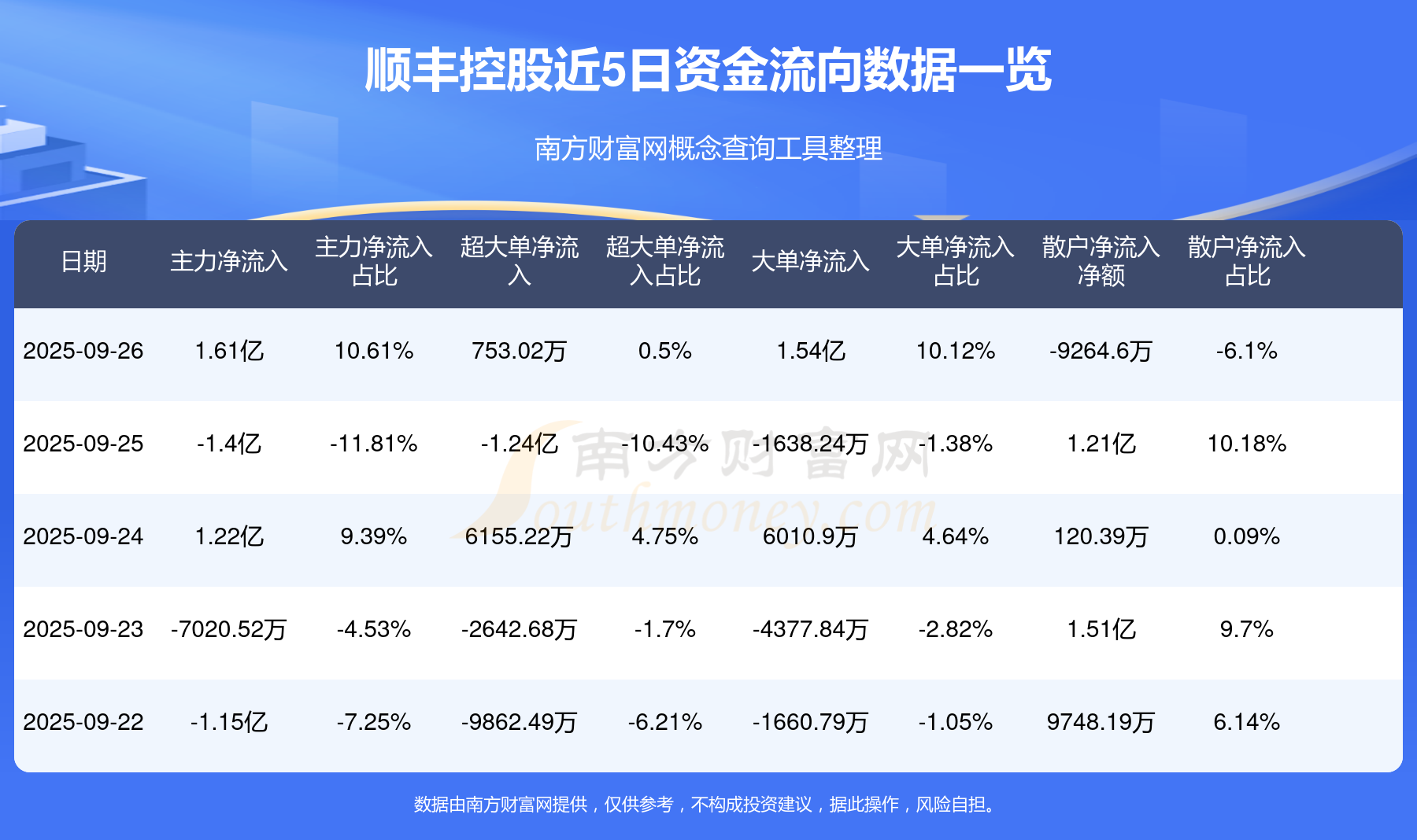 9月26日消息,順豐控股9月26日主力資金凈流入1.61億元,超大單資金凈流入753.02萬元,大單資金凈流入1.54億元,散戶資金凈流出9264.6萬元。