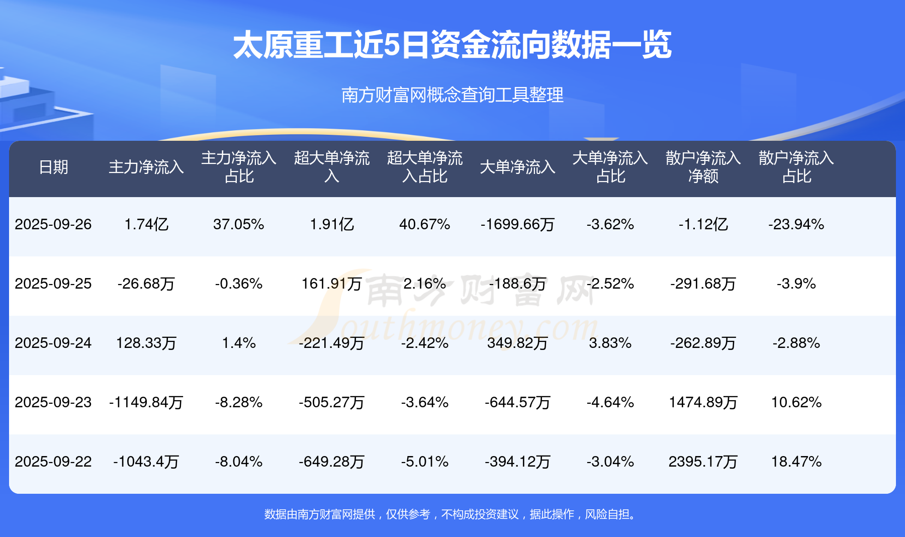 9月26日消息,太原重工資金凈流入1.74億元,超大單資金凈流入1.91億元,換手率5.28%,成交金額4.67億元。