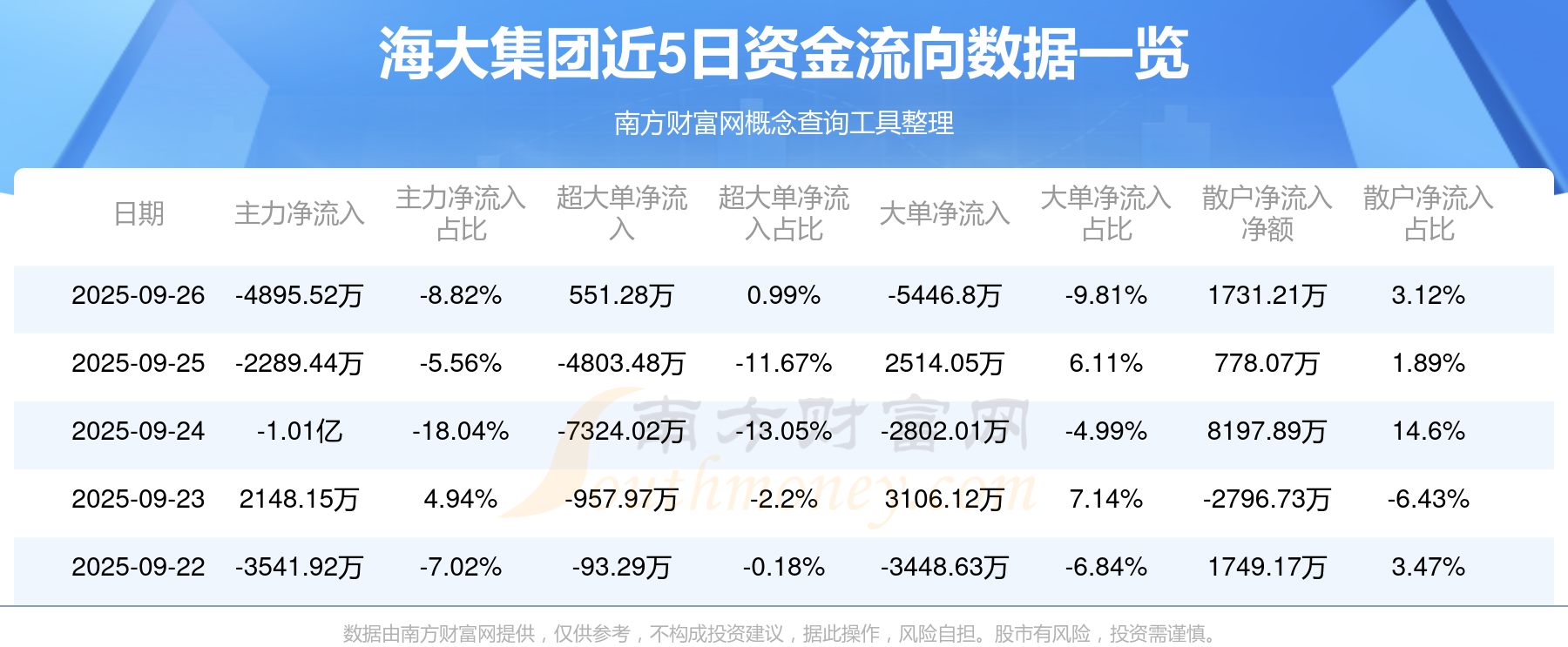 9月26日消息,海大集團(tuán)資金凈流出4895.52萬元,超大單凈流入551.28萬元,換手率0.53%,成交金額5.55億元。