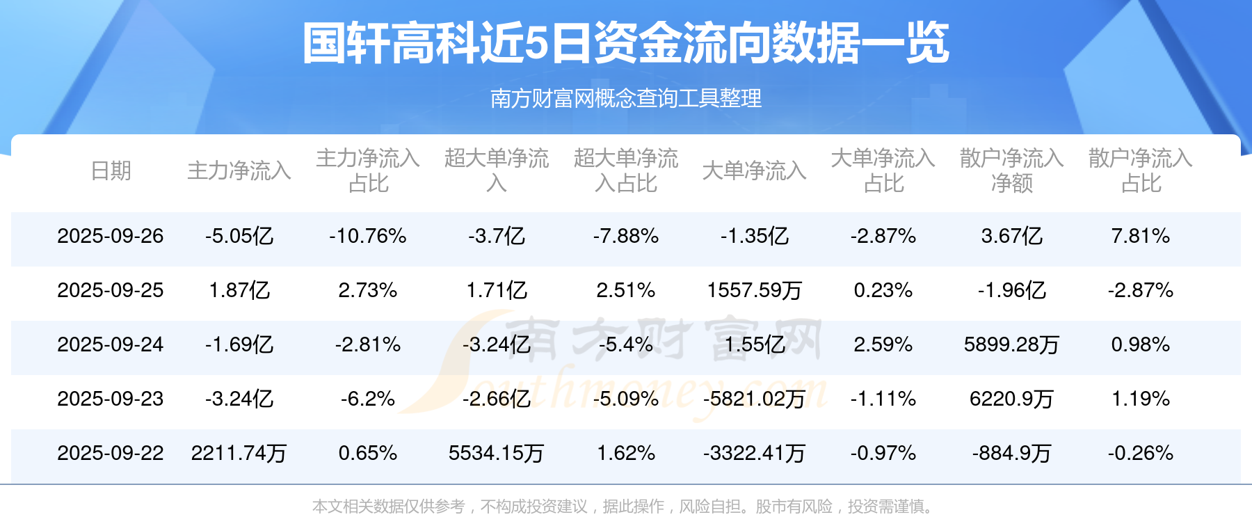 9月26日消息,國(guó)軒高科主力資金凈流出5.05億元,超大單資金凈流出3.7億元,散戶資金凈流入3.67億元。