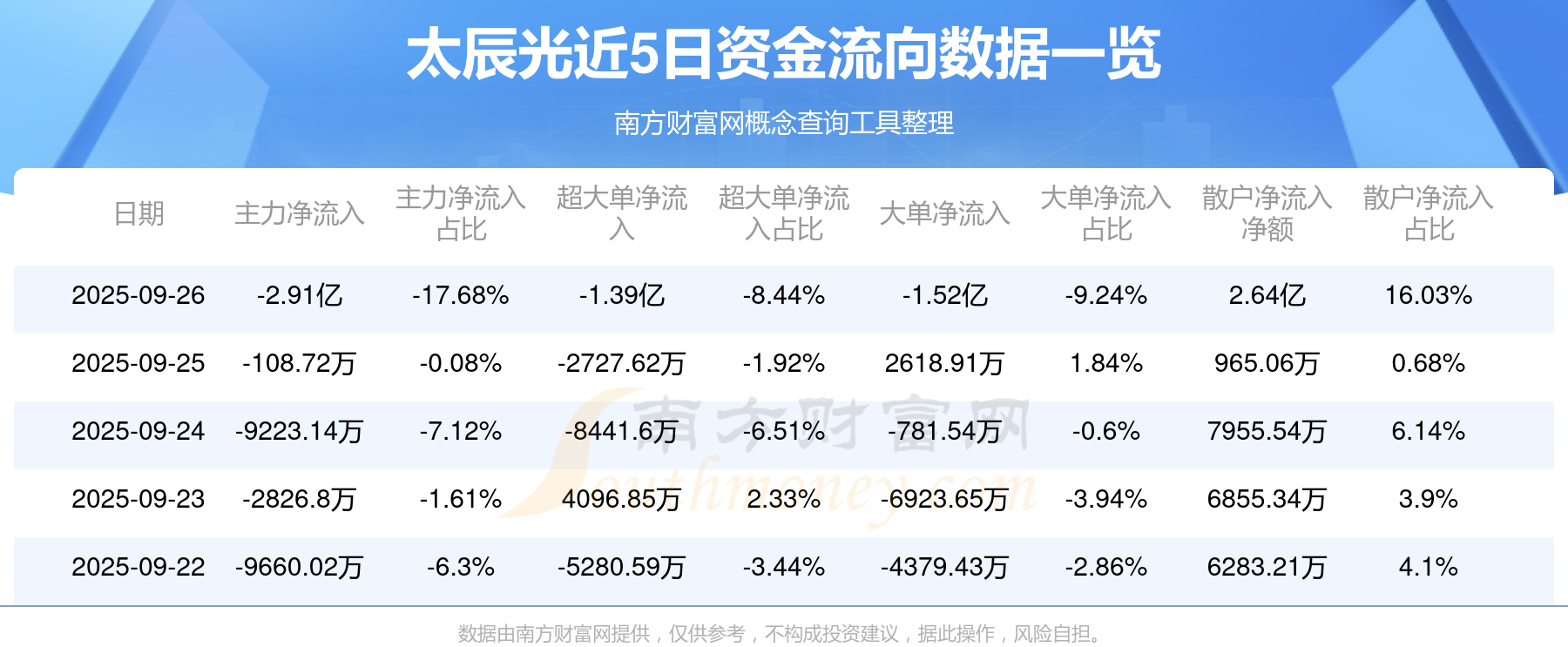 9月26日消息,太辰光9月26日主力凈流出2.91億元,超大單凈流出1.39億元,大單凈流出1.52億元,散戶凈流入2.64億元。