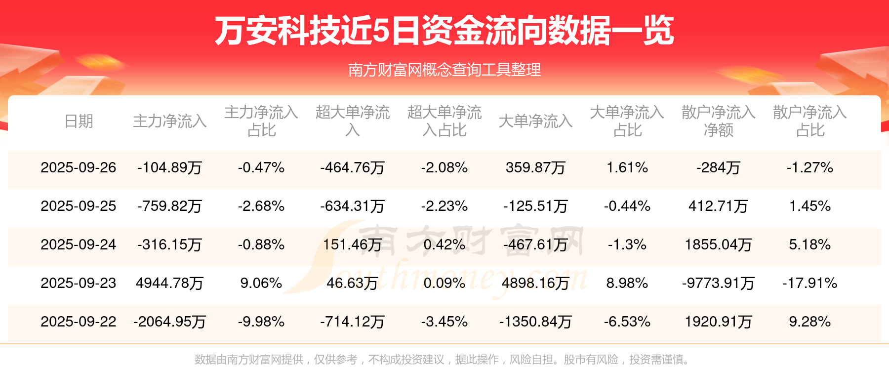 9月26日消息,萬安科技9月26日主力資金凈流出104.89萬元,超大單資金凈流出464.76萬元,大單資金凈流入359.87萬元,散戶資金凈流出284萬元。