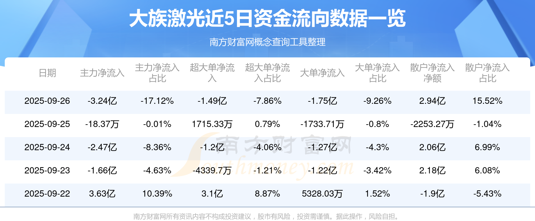 9月26日消息,大族激光9月26日主力資金凈流出3.24億元,超大單資金凈流出1.49億元,大單資金凈流出1.75億元,散戶資金凈流入2.94億元。