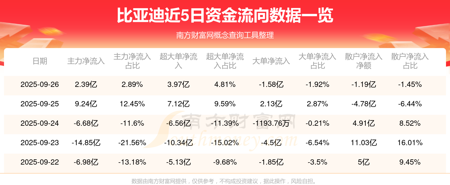 9月26日消息,比亞迪主力資金凈流入2.39億元,超大單資金凈流入3.97億元,散戶資金凈流出1.19億元。