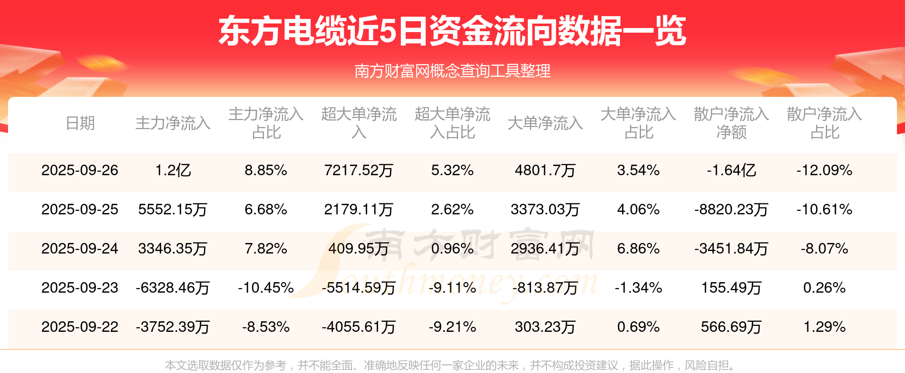 9月26日消息,東方電纜主力資金凈流入1.2億元,超大單資金凈流入7217.52萬元,散戶資金凈流出1.64億元。