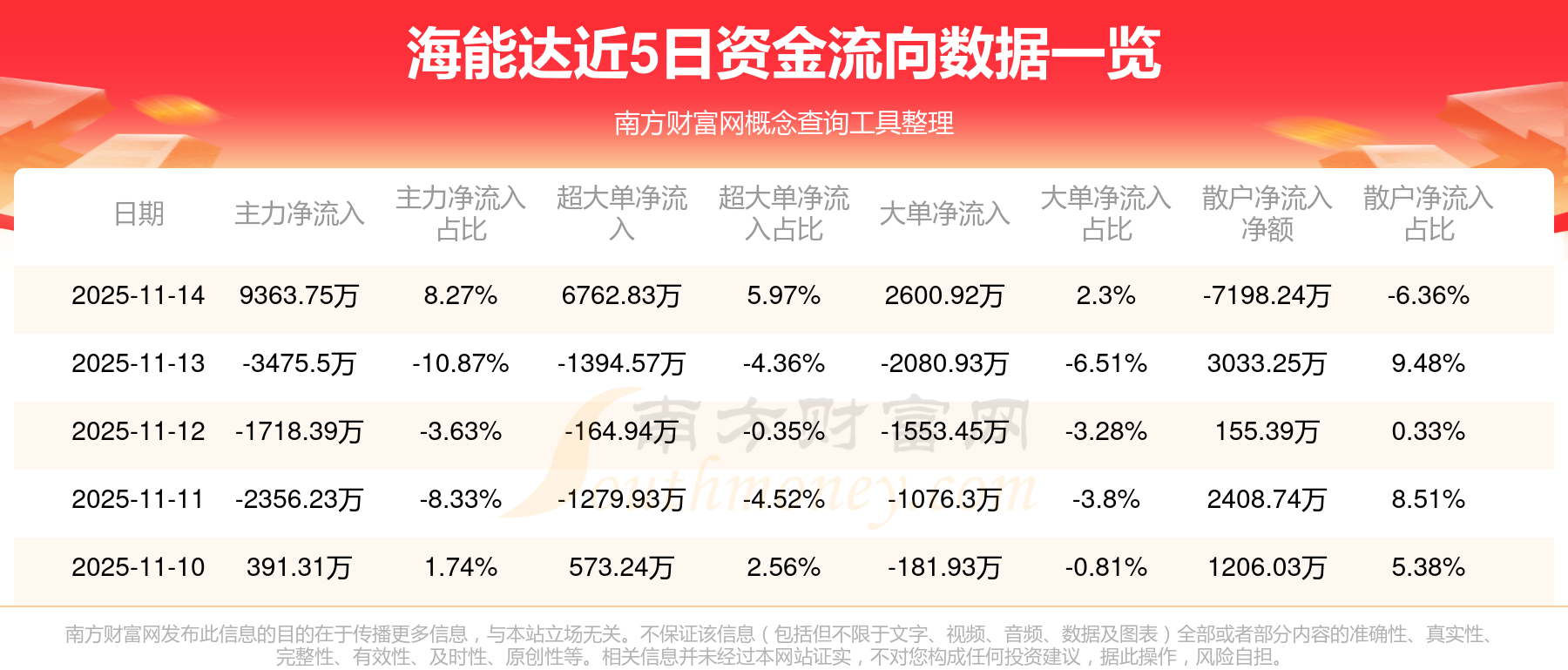 11月14日消息,海能達(dá)11月14日主力資金凈流入9363.75萬元,超大單資金凈流入6762.83萬元,大單資金凈流入2600.92萬元,散戶資金凈流出7198.24萬元。