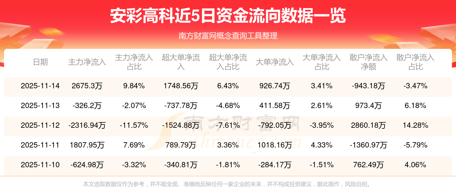 11月14日消息,安彩高科主力凈流入2675.3萬元,超大單凈流入1748.56萬元,散戶凈流出943.18萬元。