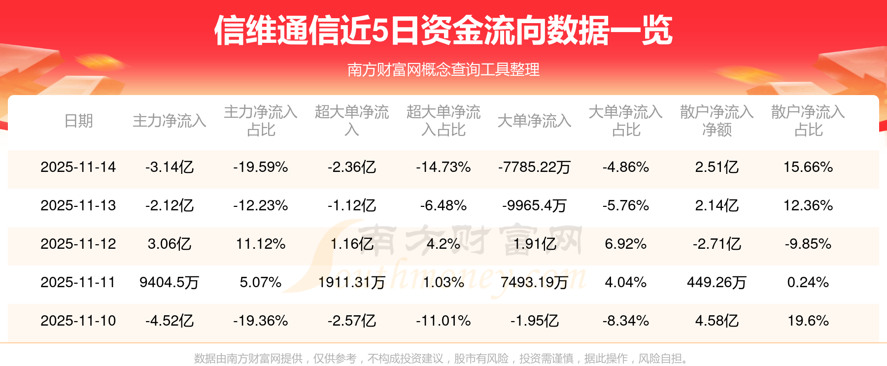 11月14日消息,信維通信資金凈流出3.14億元,超大單資金凈流出2.36億元,換手率6.15%,成交金額16.02億元。