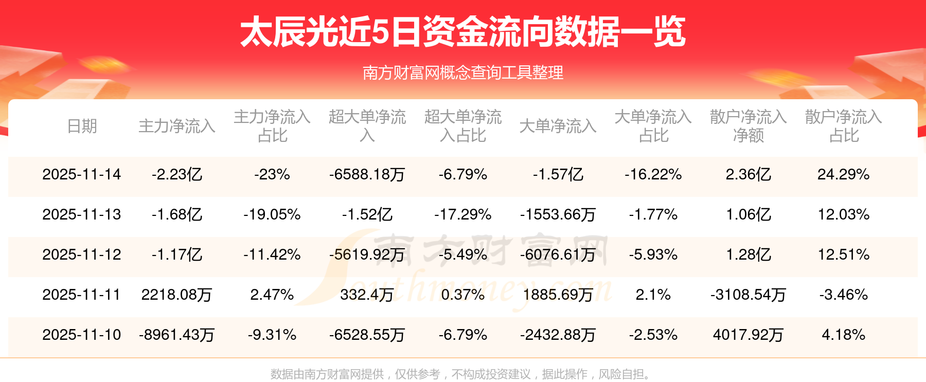 11月14日消息,太辰光資金凈流出2.23億元,超大單資金凈流出6588.18萬(wàn)元,換手率5.62%,成交金額9.7億元。