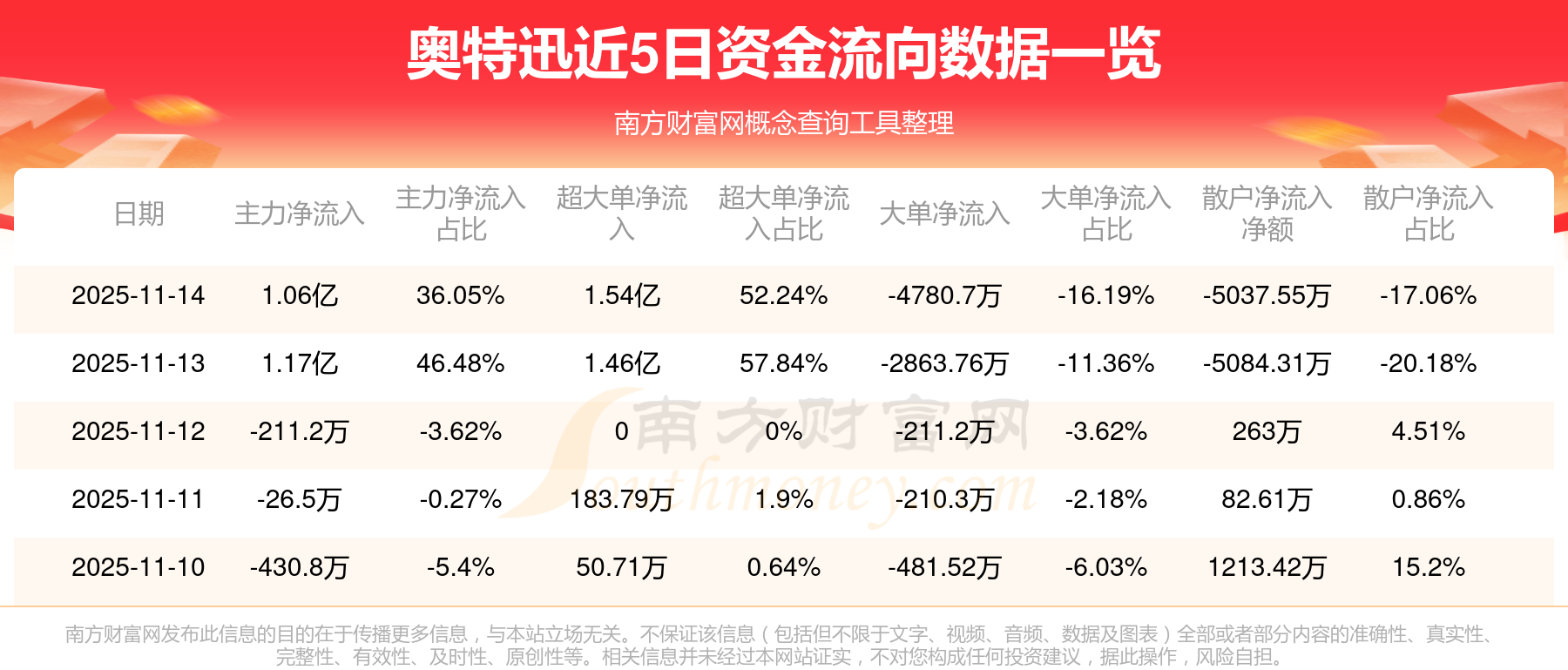 11月14日消息,奧特迅資金凈流出1.06億元,超大單資金凈流入1.54億元,最新報(bào)16.360元,換手率7.45%,成交總金額2.95億元。
