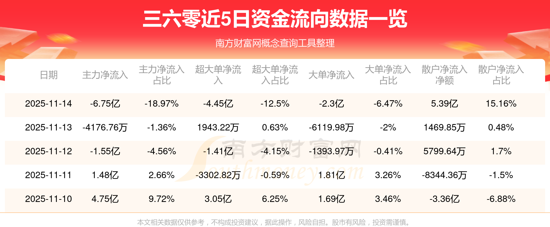 11月14日消息,三六零11月14日主力資金凈流出6.75億元,超大單資金凈流出4.45億元,大單資金凈流出2.3億元,散戶資金凈流入5.39億元。